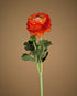 Deze elegante zijden ranunculus heeft volle, gelaagde bloemblaadjes in een warm oranje met een subtiele terracotta gloed. De natuurlijke knop en het zachte groen van het blad geven de tak een realistische en luxe uitstraling.
