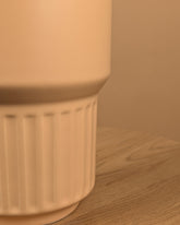 De Lodi vaas straalt een ingetogen moderniteit uit dankzij zijn zachte matt peach kleur en verfijnde vormgeving. De combinatie van een strak silhouet met subtiele verticale lijnen aan de onderzijde geeft de vaas een tijdloos en elegant karakter.